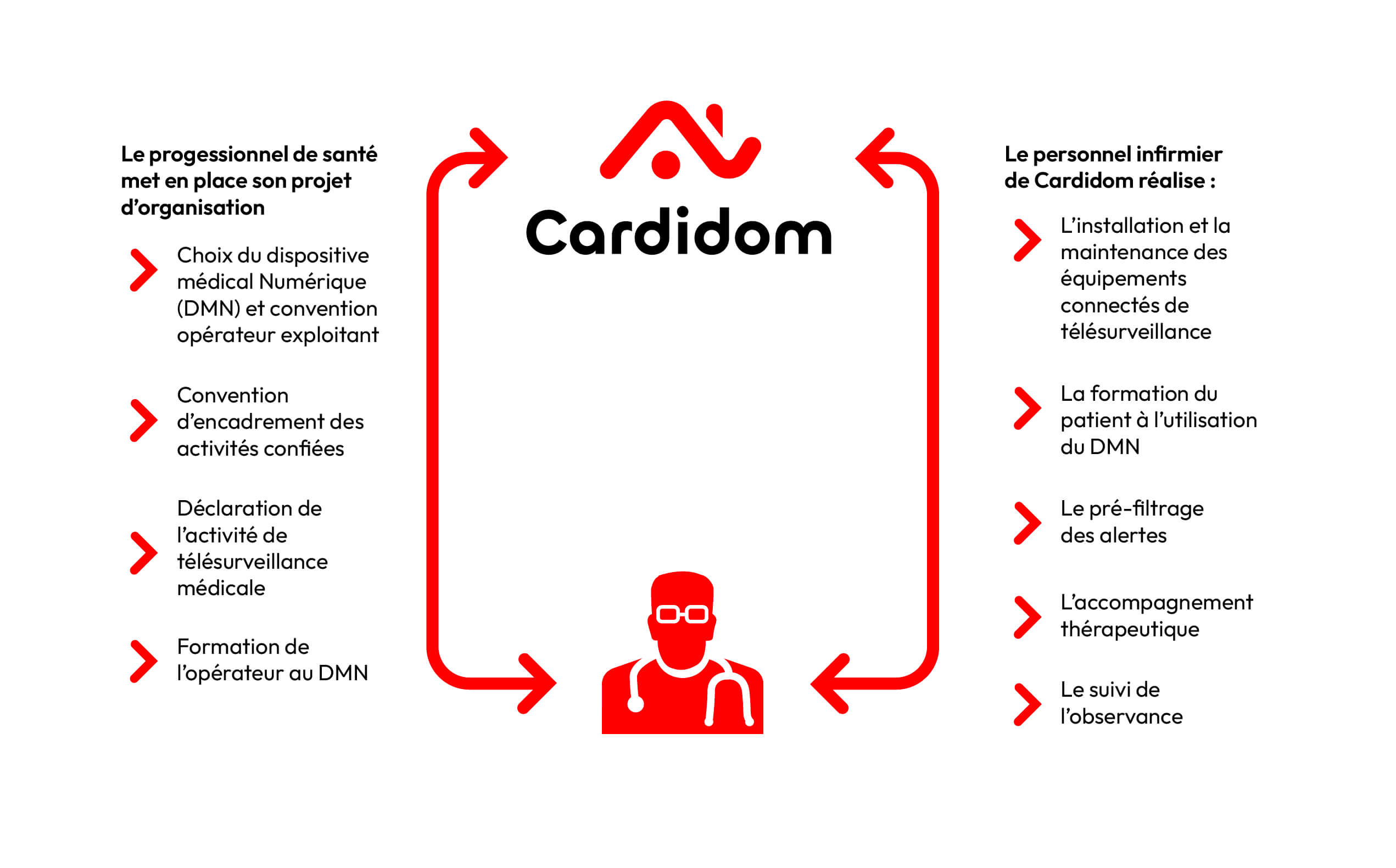 L’opérateur choisit son organisation qu’il soit seul ou en exercice coordonné et détermine si besoin, un protocole de coopération pour la délégation d’activités médicales et/ou une convention pour la délégation d’activités non médicales avec les équipes d’IDE de Cardidom.